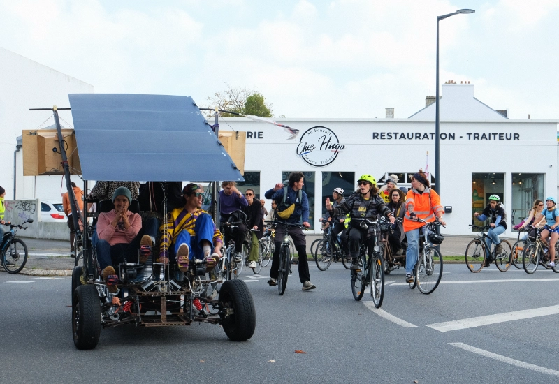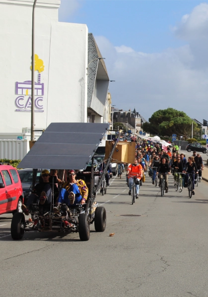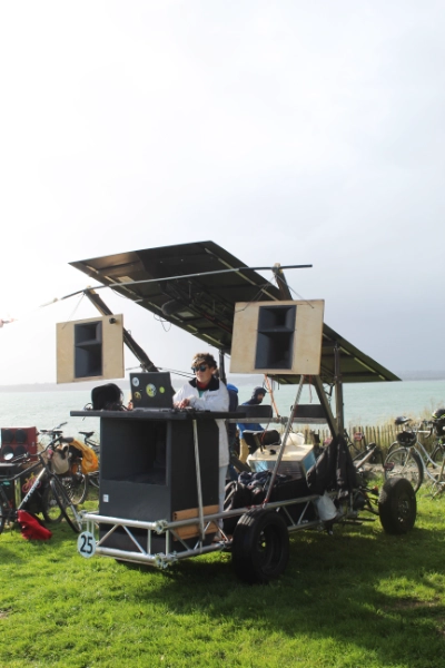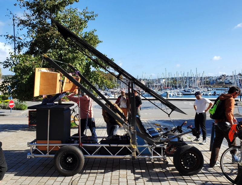 Soletta est un engin de travail et d’exploration solaire-pédales. L’énergie produite par les pédaliers-dynamo ou la toiture solaire alimente, au choix, la motorisation électrique pour se déplacer ou un ensemble d’outils, dispositif, en mode stationnaire ou à faible vitesse. Cette machine est une modeste mais honnête centrale autonome et “auto-mobile” pour explorer l’espace public, les failles urbaines, les friches, et y porter une énergie solaire et collective. Les trois premières options d’autonomie explorées sont un sound-system pour 600 personnes en plein air, un atelier chaudronnerie et un tracteur-outil pour le maraîchage comme la renaturation urbaine.